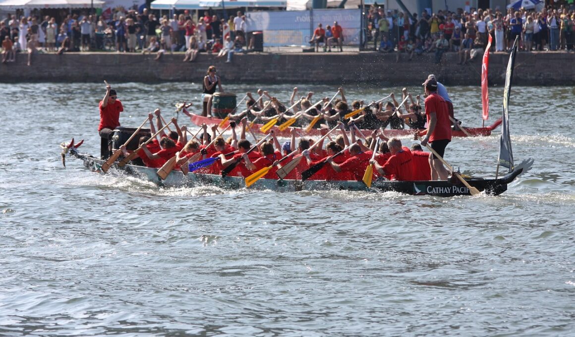 Dragon boat racing is a physically demanding team sport, where endurance plays a crucial role in achieving success. To excel in long-distance races, paddlers need to develop cardiovascular and muscular endurance. One effective approach is participating in aerobic exercises, which enhance the body’s ability to utilize oxygen efficiently. Activities such as running, cycling, and swimming are excellent for building endurance. Each session should last at least 30 minutes and can progressively increase in duration. Strength training is another vital aspect, as it supports the muscle endurance necessary for powerful strokes. Incorporate resistance exercises like squats, lunges, and rows into your routine. Don’t forget to focus on core stability as well. A strong core ensures better energy transfer while paddling, maximizing your performance. Finally, consider adding interval training to your program. This method boosts both speed and endurance, vital for maintaining a high pace throughout the race. Gradually increase the intensity and duration of your intervals to ensure consistent improvement. Remember, achieving optimal endurance is an ongoing process that requires dedication and commitment from each team member.