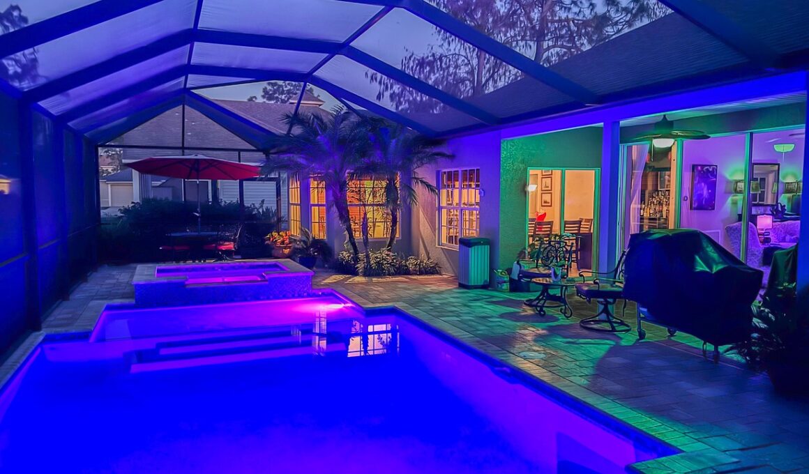 Choosing energy-efficient underwater lighting solutions is essential for those who are environmentally conscious and budget-focused. LED lights, known for their low energy consumption, provide an excellent choice for swimming pool illumination. Compared to traditional incandescent bulbs, LEDs consume significantly less energy, making them both eco-friendly and cost-effective with extended operational life. Additionally, many LED lights are available in color-changing options, allowing for customizable ambiance at users’ discretion, further improving energy use. While setting up the lighting, remember to consider solar-powered options that utilize sunlight for energy conversion, reducing overall electricity demand. Offering an added advantage, solar lights can operate independently from traditional power sources, promoting environmentally friendly practices. Furthermore, be mindful of light pollution and the effect your lighting may have on the surrounding landscape. Employing fixtures that direct light downward rather than outward minimizes unnecessary illumination, respecting nearby ecosystems and wildlife. Incorporating environmentally responsible solutions and energy-saving technology contributes to a sustainable approach in maintaining swimming pools. Overall, making thoughtful decisions regarding energy consumption ultimately leads to environmental benefits and helps in reducing operational costs.