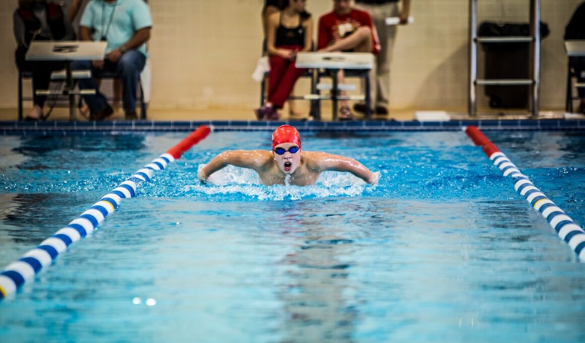 Each stroke’s technique is further enhanced by understanding the underlying biomechanics. For instance, in freestyle, the importance of a streamlined position cannot be overstated. Key components include a flat body profile and minimal resistance to water. Swimmers should also focus on their hand entry; it should be at the highest point before slicing into the water. Utilizing the forearm to catch and pull water creates a powerful propulsion force. Similarly, effective breathing coordination ensures minimal disruption in stroke rhythm. In butterfly, the simultaneous movement of arms causes unique challenges, emphasizing the need for core strength and timing. Proper undulation in the body enhances movement efficiency. Detailed analysis often reveals common errors, such as overreaching, which can lead to inefficiencies. Training sessions should incorporate drills that emphasize these elements. Visual aids can enhance understanding, so swimmers must also spend time watching skilled swimmers. Training in varying phases, including pre-season, in-season, and championship phases, will improve overall performance. Moreover, with appropriate recovery techniques, athletes can maintain peak conditions and avoid overtraining, thereby ensuring competitive readiness. Regular evaluations and adjustments to technique are essential in highlighting improvement areas for every swimmer involved.
